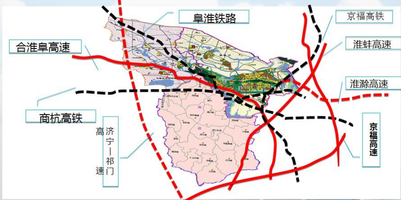 There are four expressways, namely, Beijing-Fuzhou Expressway, Hefei-Huainan-Fuyang Expressway, Huainan-Bengbu Expressway, and Jinan-Qimen Expressway, and one national highway, that is, 206 National Highway. Departing from the downtown of the city, we can arrive in Hefei within 1 hour, arrive in Nanjing within 3 hours, and arrive in Shanghai, Hangzhou, Nanchang, Wuhan, Zhengzhou, and Jinan within 6 hours.