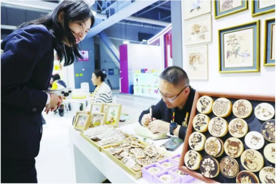 Integrating the elements of CIIE, Huainan Shanhetang Art Co., Ltd produced wooden pyrography badges, refrigerator stickers, and auspicious patterns such as Five Blessings Welcoming Wealth that were deeply loved by young people.