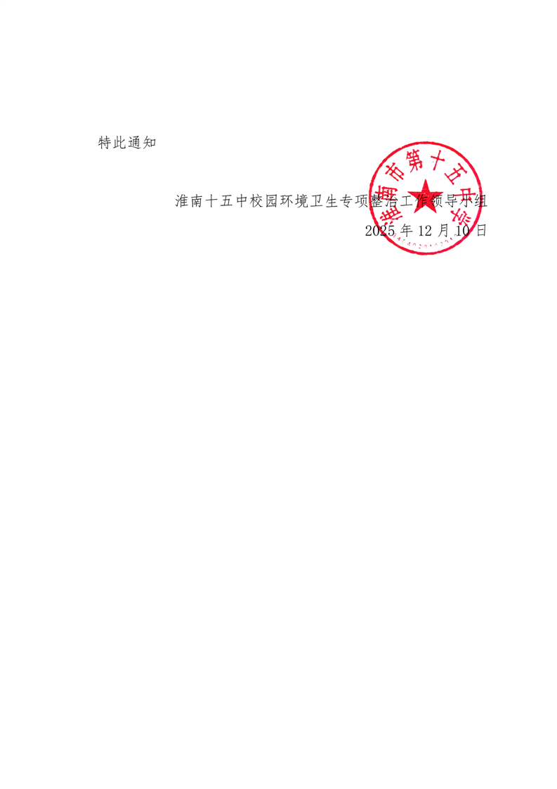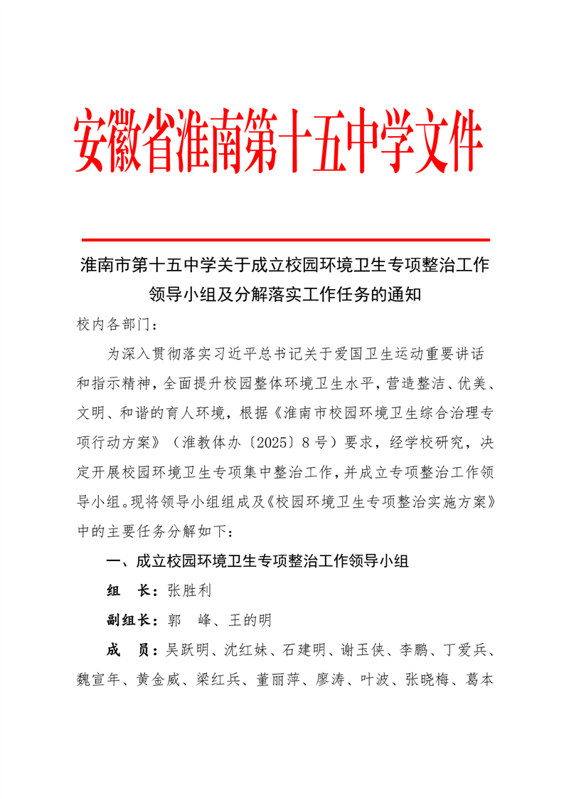 淮南市第十五中学关于成立校园环境卫生专项整治工作领导小组及分解落实工作任务的通知_政务公开_淮南市人民政府