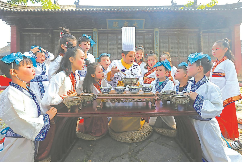 日前,国家级非遗——寿州豆腐宴制作技艺传承人张士宏为孩子们介绍八公山豆腐文化和豆腐雕刻技艺。