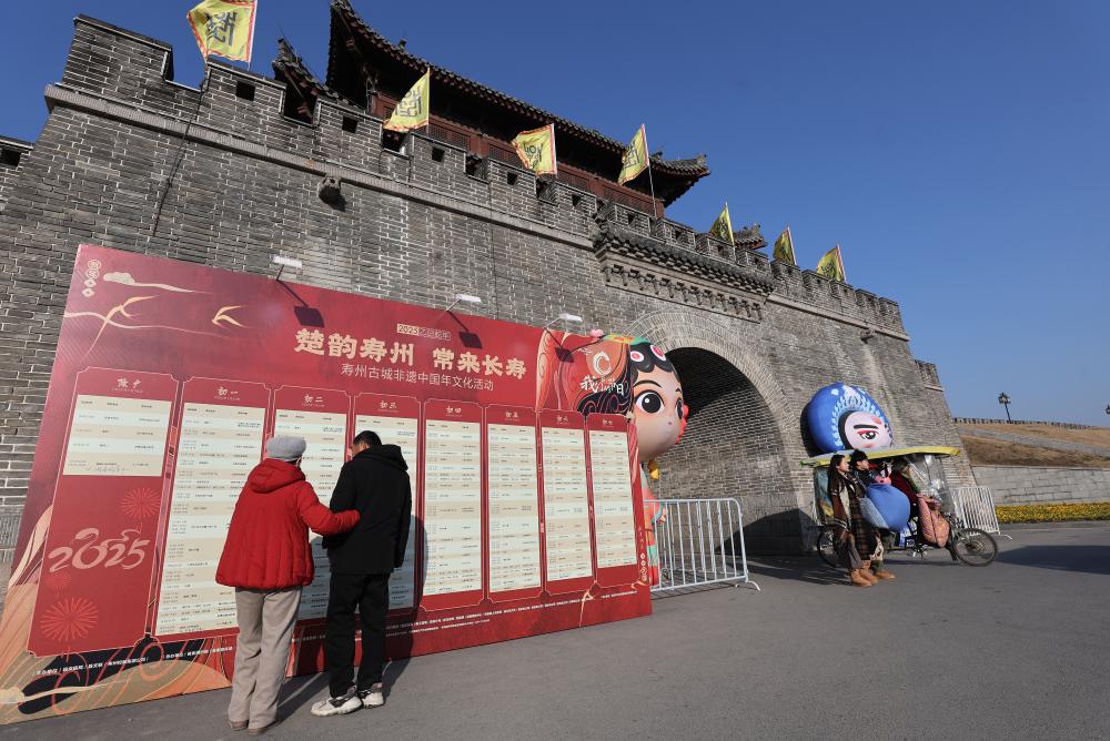 2024年,“春节”被列入人类非物质文化遗产代表作品名录。2025年,乙巳蛇年“非遗过大年”的概念更加火爆。在国家级历史文化名城寿县,古城内外处处洋溢着欢庆气息。从除夕到年初七,寿县陆续推出春节系列文化活动,有除夕撞钟祈福、寿州古城迎春礼暨蛇年拜年祝寿大会、楚都迎宾礼、龙狮踩街大巡游、新春城墙光影秀、水上“非遗”火秀、全民迎财神蛇年戏曲电音狂欢夜,以及“非遗”项目展演和“淝水之战”等沉浸式演艺等活动,尽显“非遗”传承、国粹之美。本版图片为1月30日大年初二,寿县古城欢庆春节的热闹景象。