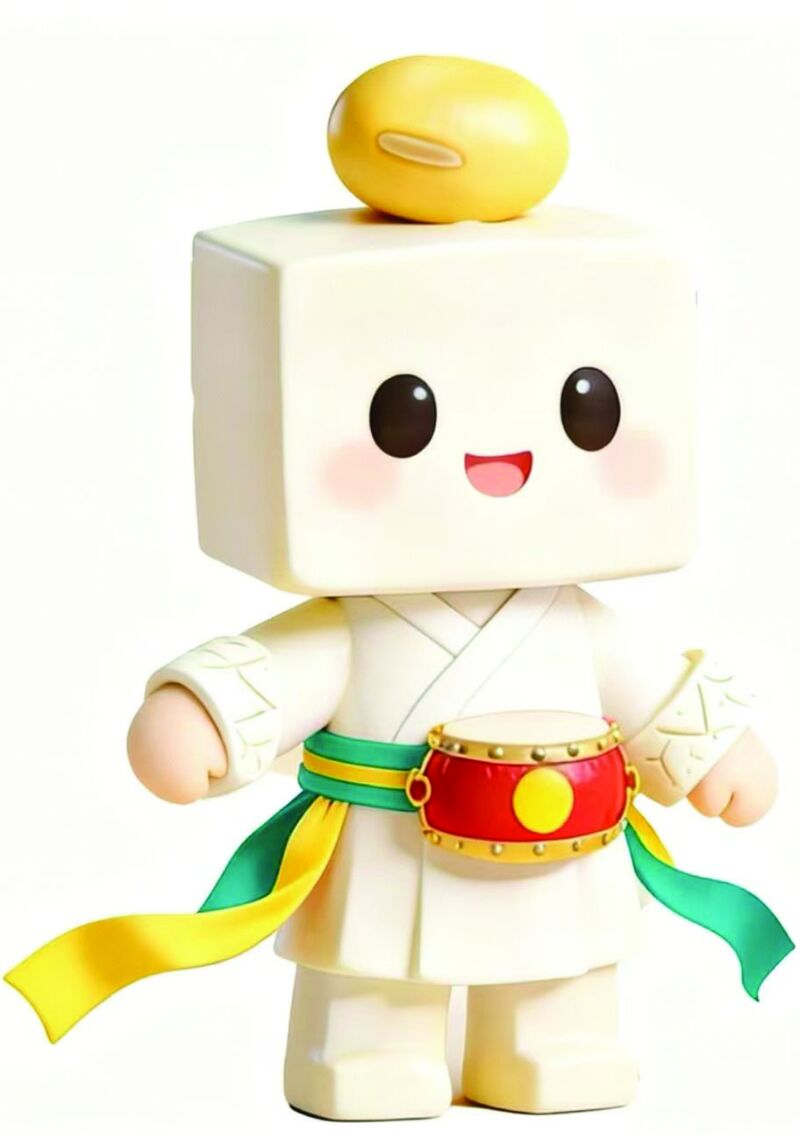 淮豆豆与淮楚楚出生于安徽淮南,是一对充满活力与文化底蕴的卡通兄妹。在形象设计上,二人以洁白圆润的豆腐为主体造型,彰显淮南“豆腐之乡”的地域特色;腰间均佩戴花鼓灯样式腰鼓,将国家级非物质文化遗产花鼓灯元素融入设计,既象征对非遗的传承与演绎,又生动诠释了艺术从娃娃抓起的理念。