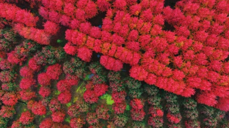 立冬后,毛集实验区的红枫林迎来最佳观赏期,漫山遍野的绯红如同热烈的火焰,将天地渲染成一幅壮丽的油画。游客们穿梭其间,或漫步拍照,或孩童嬉戏,尽情沉浸在这片初冬盛景之中,感受季节流转的静好。
