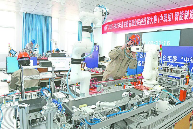 2月7日,2025—2026年度安徽省职业院校“中银杯”技能大赛(中职组)智能制造设备技术应用、数字孪生技术应用等3个赛项和1个赛组比赛在淮南举行,全省67支参赛队约400名师生参加比赛。图为参赛选手在智能制造设备技术应用赛项中竞技。