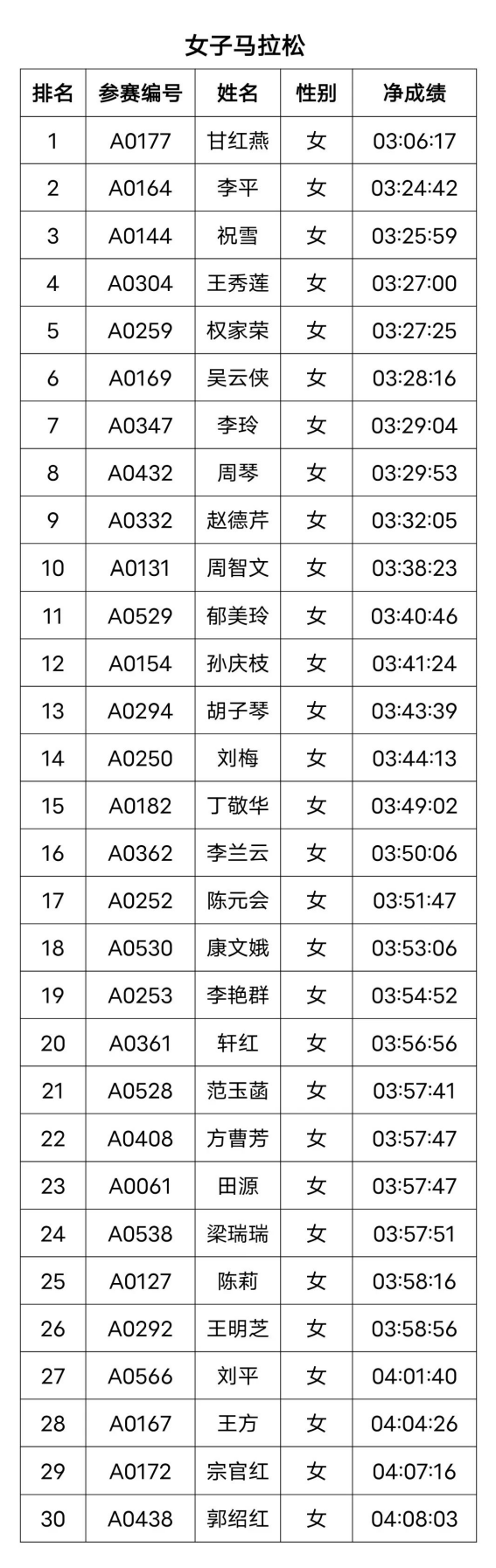 组委会办公室于公示期内收到参赛号为B1973的参赛选手张桂芹的资审证明材料,经过核查,此选手提供的资料真实有效,故按其完赛成绩进行排名,其他获奖选手名次顺延。