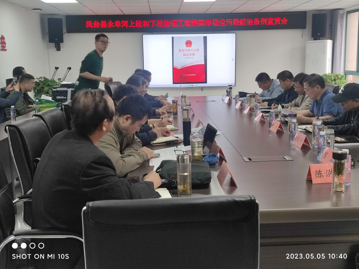 5月5日上午,市水利局副局长高阳同志在凤台县永幸河上段和下段治理工程建设管理中心召开淮南市扬尘污染防治条例宣讲会。凤台县水利局局长石明,监管中心负责人等相关同志参加了会议。