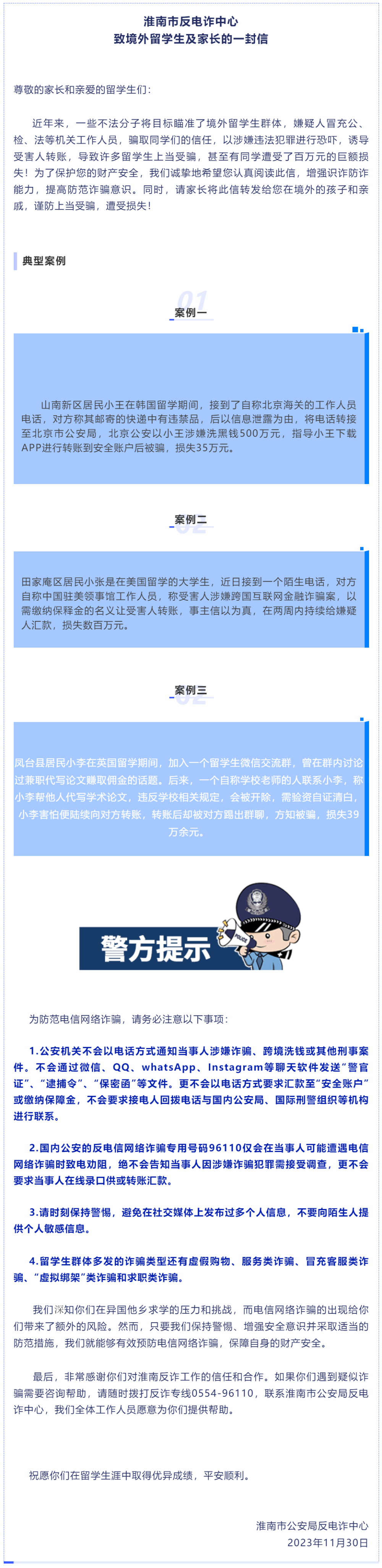 【预警信息】淮南市反电诈中心致境外留学生及家长的一封信_淮南市人民政府